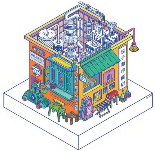 画面以2.5D的透视关系表达,以等轴测参考线去绘制,元素诸多,且与咖啡及品牌调性紧密结合,色彩饱和明快,同时以波点的细节处理介入,使得画面更加紧凑完整。