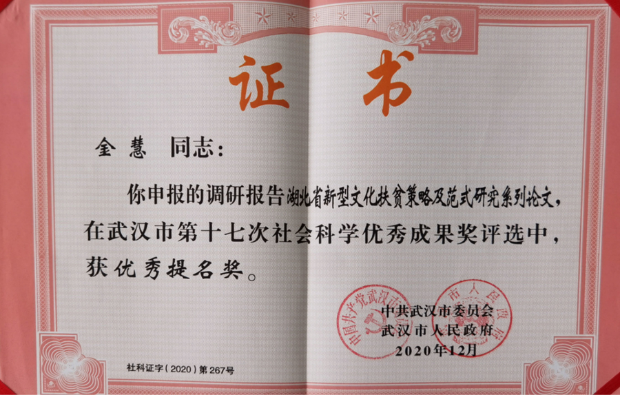 近日,武汉市委办公厅市政府办公室联合下发《市委办公厅、市政府办公厅关于武汉市第十七次社会科学优秀成果奖的通报》(武办2020第60号),从武汉大学、华中科技大学等众多在汉高校、科研单位申报的社科研究成果中,评选出一等奖20项、二等奖55项、三等奖85项、优秀提名奖118项和5项优秀组织奖,其中仅有2所民办高校的成果获奖。我校艺术与传媒学院设计系金慧教授完成的调研报告《湖北省新型文化扶贫策略及范式研究系列论文》荣获优秀提名奖。2021年4月16日,武汉市委市政府在武汉会议中心召开了武汉市社科联第六届委员会第六次全体(扩大)会议暨市第十七次社科获奖成果颁奖表彰大会,市委市政府市人大市政协的领导出席了颁奖仪式。我校金慧教授作为获奖单位代表,应邀参加了会议并领奖。
