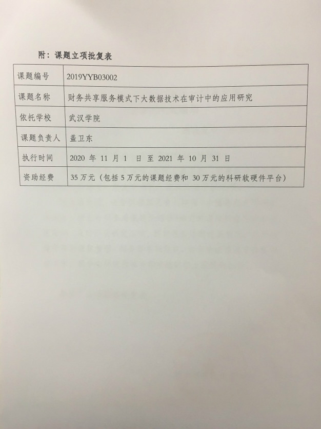 近日,教育部科技发展中心下达立项课题批复通知,我校会计学院副院长盖卫东博士主持的课题“财务共享服务模式下大数据技术在审计中的应用研究”,经资格预审和专家审核,获教育部科技发展中心高校产学研创新基金课题立项,课题资助经费35万元(包括5万元的课题经费和30万元的科研软硬件平台)。