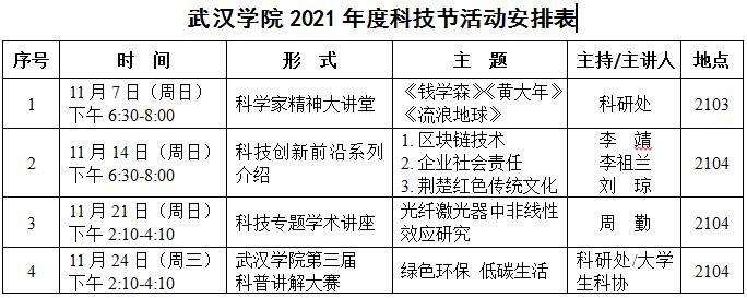 科研处会同学工处、武汉学院科学技术协会、武汉学院大学生科学技术协会,将于11月7日—11月24日,举办武汉学院2021年度科技节。