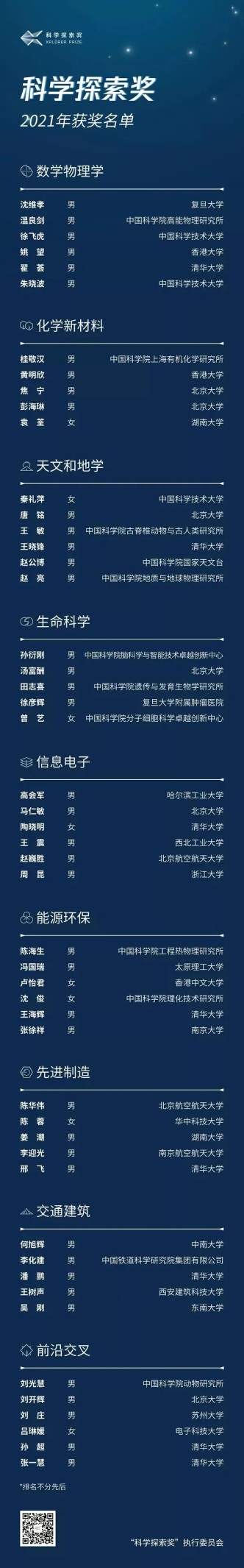 据“科学探索奖”秘书处介绍,今年最大的特色,就是获奖人较去年更为“多元化”,这也印证着中国科技创新的蓬勃发展和人才创新生态环境的不断优化。