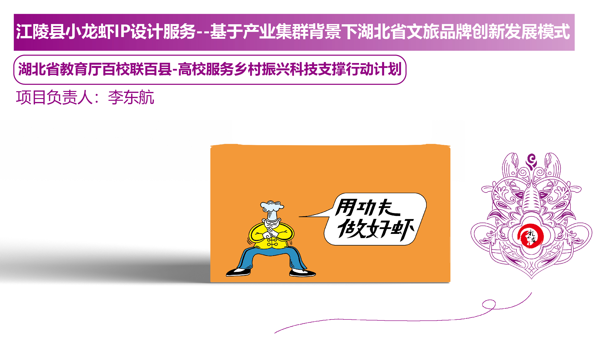 “江陵县小龙虾IP设计服务--基于产业集群背景下湖北省文旅品牌创新发展模式”是艺术与传媒学院李东航老师主持的湖北省教育厅“百校联百县——高校服务乡村振兴科技支撑行动计划”科研项目,于2021年7月立项建设。该项目与荆州礼小龙生态农业科技有限公司合作,以品牌创新发展为主线,以实际案例——礼小龙虾品牌为依托,研究湖北省江陵县区域品牌在产业集群背景下的系列性关联点。立项之后,李东航老师严格执行项目计划,积极投入该项目的研发。目前,该项目已经完成初期设计,进入服务地方经济的试用阶段。
