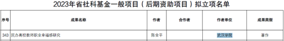 近日,我校外国语学院院长陈金平教授申报的著作《民办高校教师职业幸福感研究》获得了2023年度省社会科学基金一般项目(后期资助)立项。省社科基金项目是湖北省哲学社会科学领域级别最高、分量最重、最具学术权威的科研项目,是高校科研建设的重要指标,该立项将为我校在人文社会科学领域的研究与探索再添新动力。