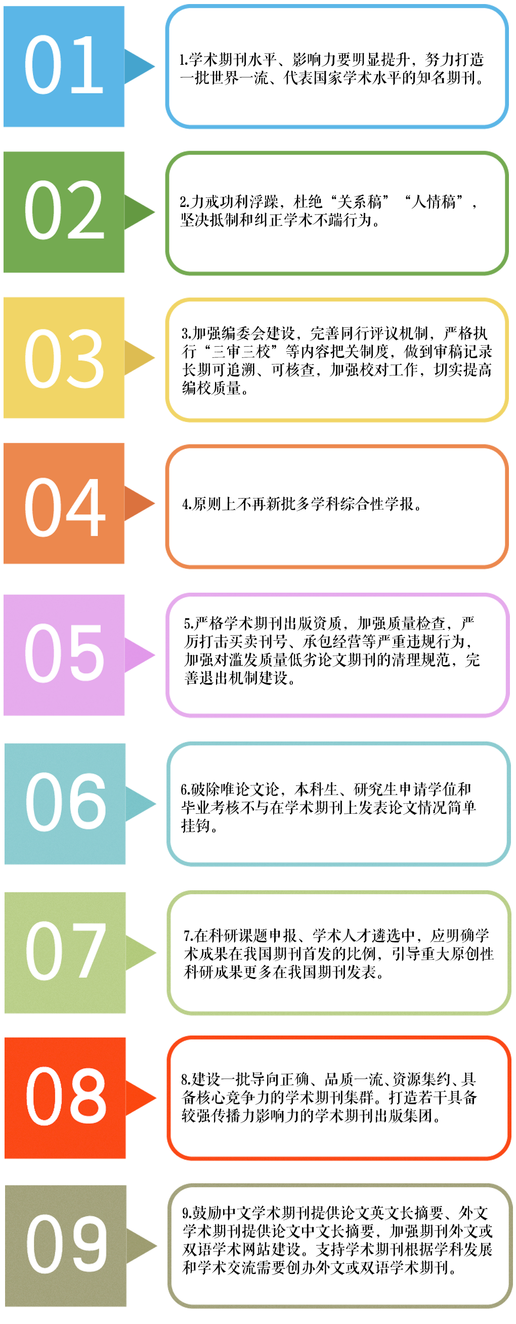 近日,中共中央宣传部、教育部、科技部联合印发了《关于推动学术期刊繁荣发展的意见》(以下简称《意见》,文末左下角“阅读原文”查看详情),《意见》明确提出学术期刊水平、影响力要明显提升,努力打造一批世界一流、代表国家学术水平的知名期刊。并明确提出课题申报中,应明确学术成果在我国期刊首发的比例,杜绝“关系稿”“人情稿”,坚决抵制和纠正学术不端行为;本科生、研究生申请学位和毕业考核不与在学术期刊上发表论文情况简单挂钩等推动学术期刊繁荣发展的14点意见,意见全文及要点如下: